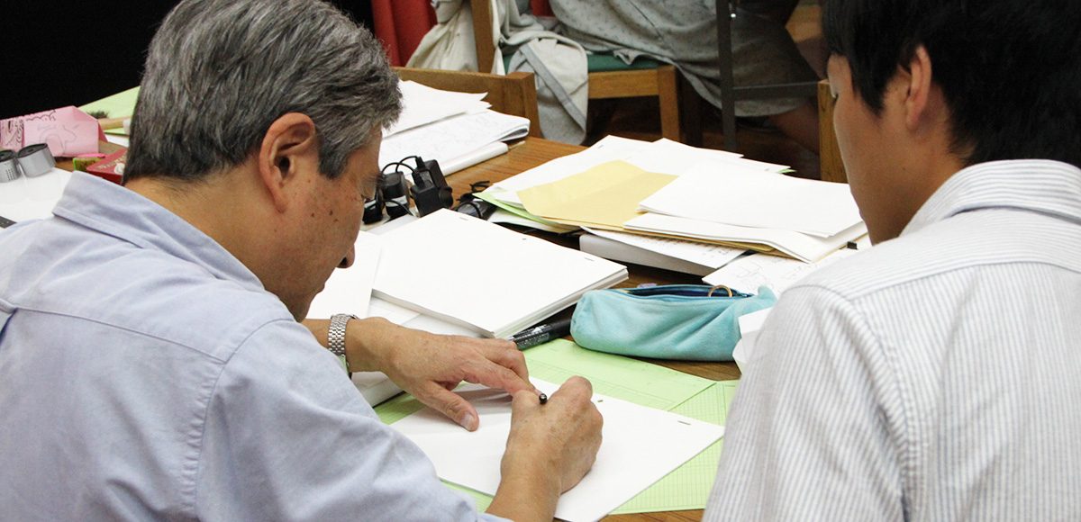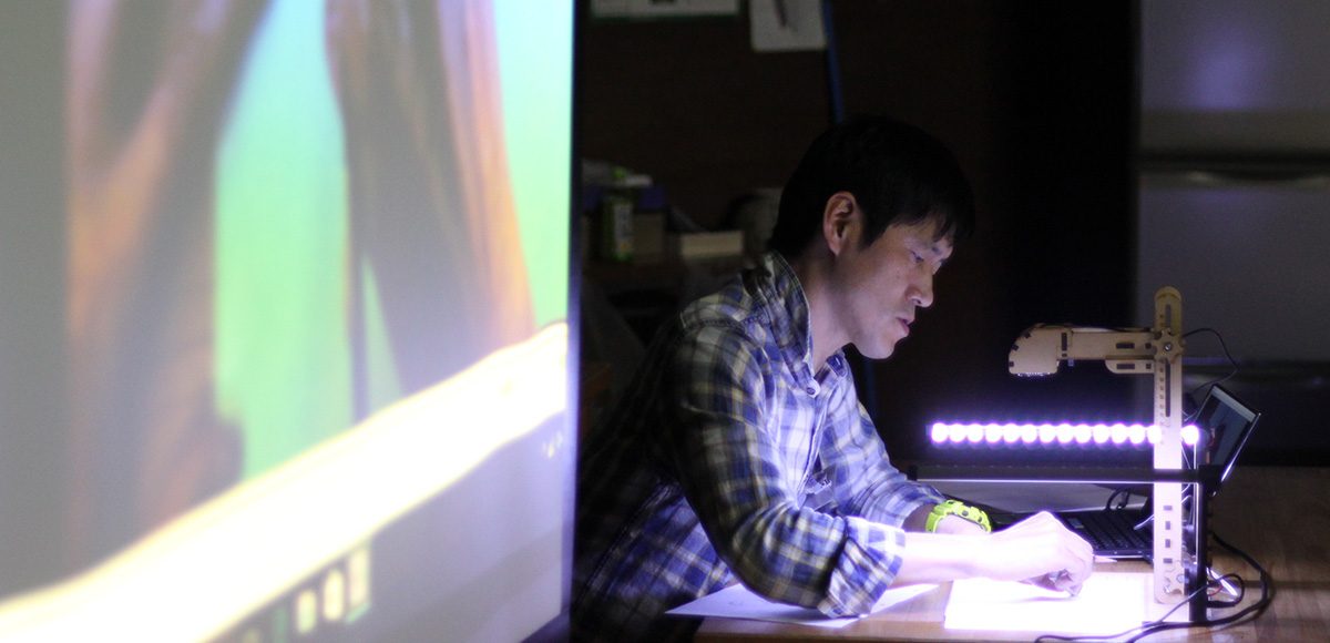 課題に取り組む過程で、講師たちは、参加者たちの「こうしたい」に応える形で、実際に描いてみせながら作画のポイント、問題解決のヒント、異なるやり方の可能性などを示します。第一線で活躍するプロのアニメーター達が学生たちと机をならべ、一日中すぐ間近にいて濃密な指導を行ってくれる点は、本プログラムならではの特徴といえます。